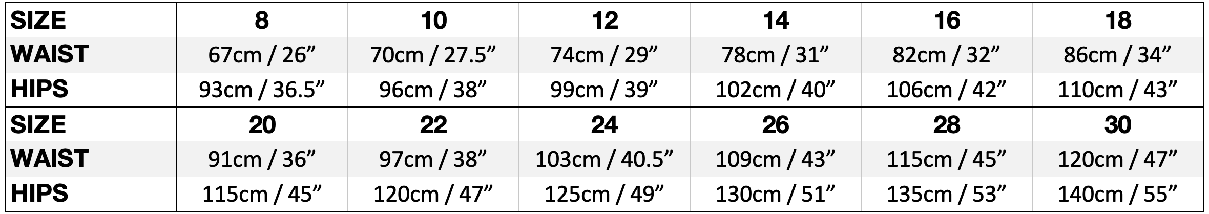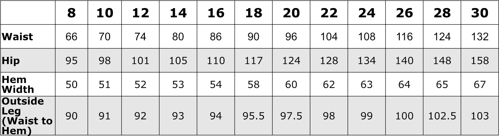 • Zip: Size 8-18 = 18cm/7”; 20-26 = 20cm/8”; 28 = 23cm/9”; 30 = 25cm/10”